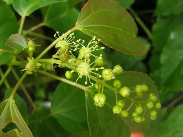 《神农本草经》称巴豆为“巴菽”,李时珍解释为“出自巴蜀,形如菽[shū]豆”。但巴豆长得不太像豆,它是一种高达五六米的大灌木或乔木,叶子类似樱桃叶。初夏时会开出由许多青黄色小花组成的总状花序,花分雌雄,虽然很小但还是可以分辨。雌花有3根柱头,每根都深裂为二,看上去像有6根触手;雄花的触手(花丝)更多,可以看见花药。