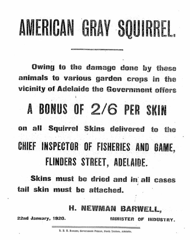 澳大利亚的灰松鼠悬赏令。澳大利亚的幸运之处在于引入灰松鼠的地方较少,及时消灭了。图片:Peacock / Victorian Naturalist (2009)