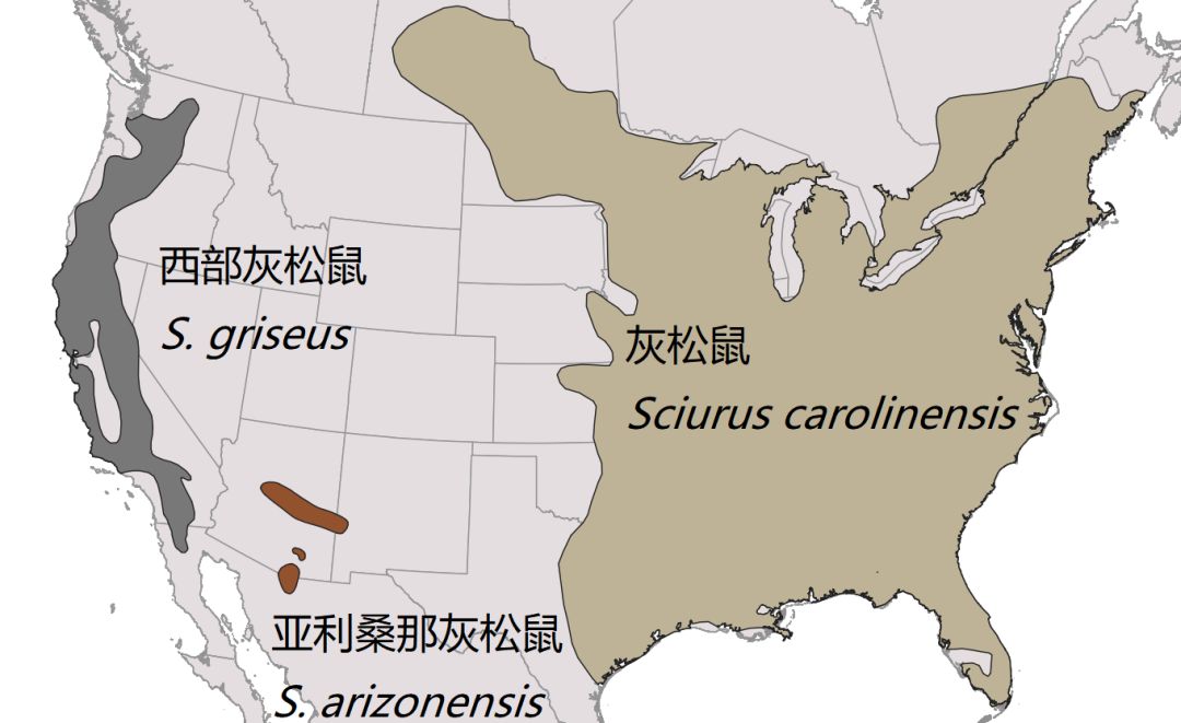 还是想先说一些细节:在北美大陆,被称为“灰松鼠”的其实有三个同属物种:今日主角灰松鼠,种本名意指“卡罗莱纳州”,英文名Eastern Gray Squirrel,老家在北美大平原以东的阔叶林;在针叶林占优势的北美西部海岸山脉生活着西部灰松鼠(S. griseus,Western Gray Squirrel);在亚利桑那州有林子的山谷里和墨西哥边境地区,还特有一种亚利桑那灰松鼠(S. arizonensis,Arizona Gray Squirrel)。