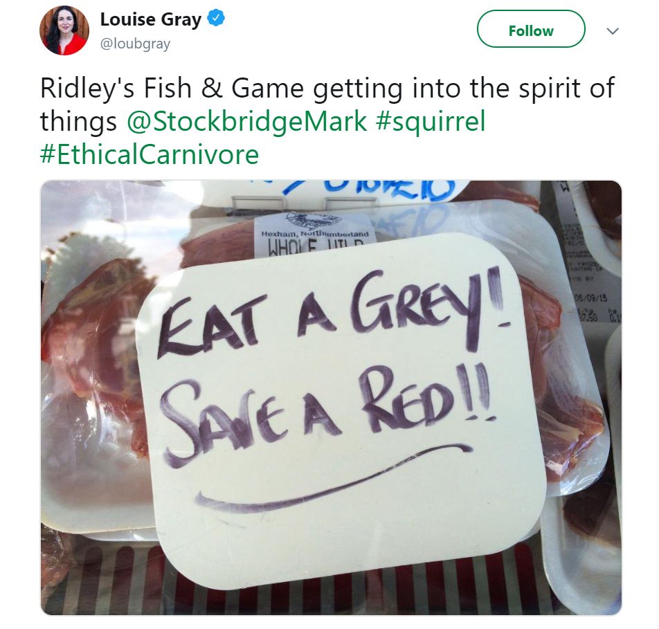 有人号召“吃一只灰松鼠,就是救一只红松鼠”的#道德吃肉 运动#EthicalCarnivore 。图片:loubgray / twitter
