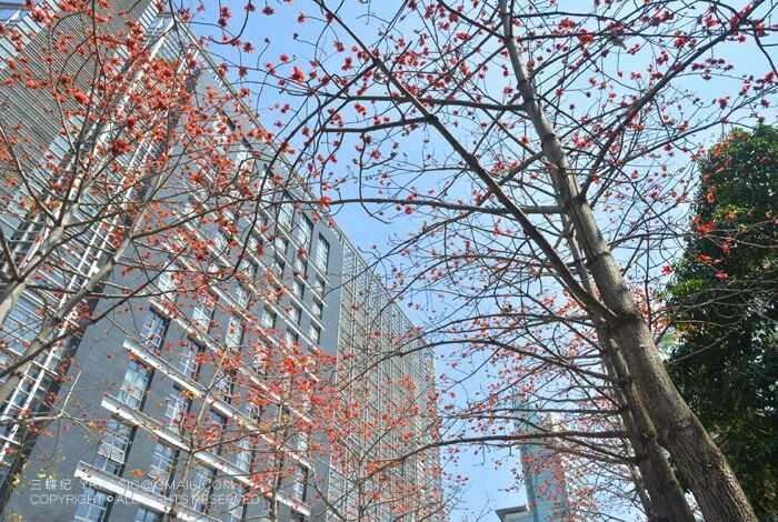 除了落叶的树,开花的树也是深圳春天少不了的。最有代表性的是一红一黄——木棉和黄花风铃木。