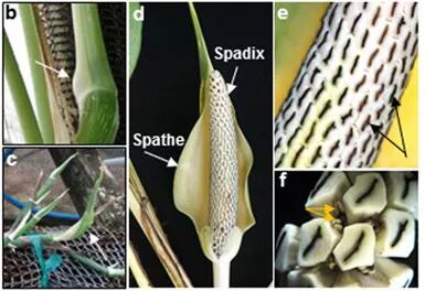 图中间就是在赤霉素诱导下开出的绿萝花,它有着天南星科典型的佛焰苞和肉穗花序。图片:Chiu-Yueh Hung et al. / Nature(2016)