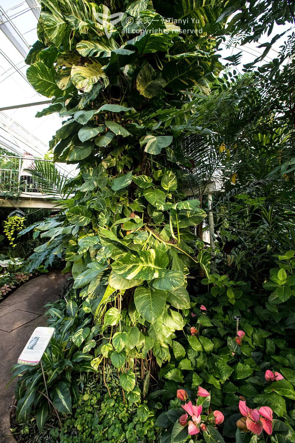 Wisley园温室里的绿萝,可以看到下部叶片很小,上部叶片变得极大。图片:余天一