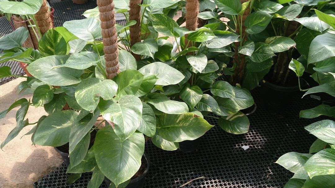 大型绿萝盆栽的生产商会使用棕柱(里面是竹子,外面裹的是棕榈树干上的网状纤维)进行牵引,让绿萝找到攀附物,长出粗壮的茎和硕大的叶片。棕柱外层疏松多孔,可以让绿萝用于攀援的气生根在柱子上扎根,同时也可以充分吸水,给气生根提供水分。