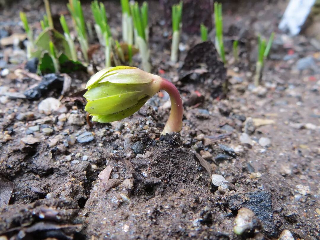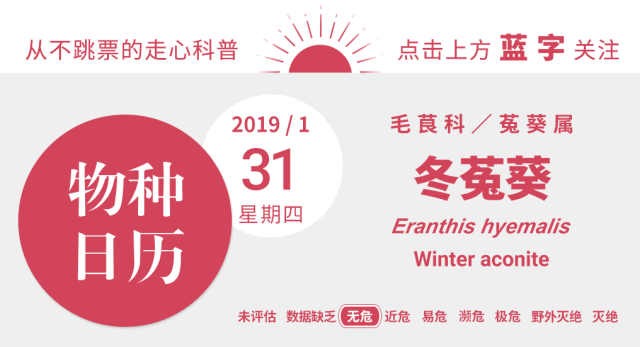 菟葵属的拉丁学名Eranthis,来自希腊文'Er'和'anthos',意为“春天的花”。新年甫至,冬菟葵就已迫不及待地从林下次第钻出,无惧凛冽寒风和残存冰雪。刚破土时的花葶,像是垂首的向日葵,还不曾引人瞩目。在低垂的花葶顶端,有一层嫩绿色“萼片”紧裹着,这其实是它的叶状苞片,用来保护脆弱的内部结构。随着植株的生长,它的叶状苞片又会舒展成一件深裂舞裙,像叶片一样承担起光合作用。