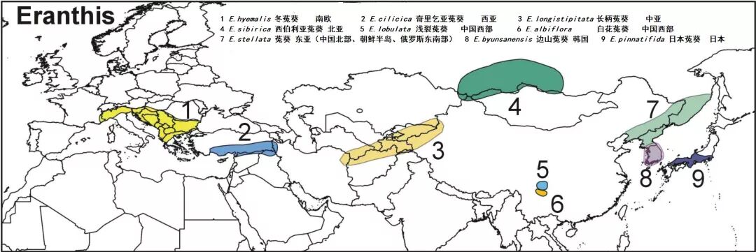菟葵属植物分布图,点击可放大。图片:Nalagtus / wikipedia;汉化及图片修正:江南蝶衣