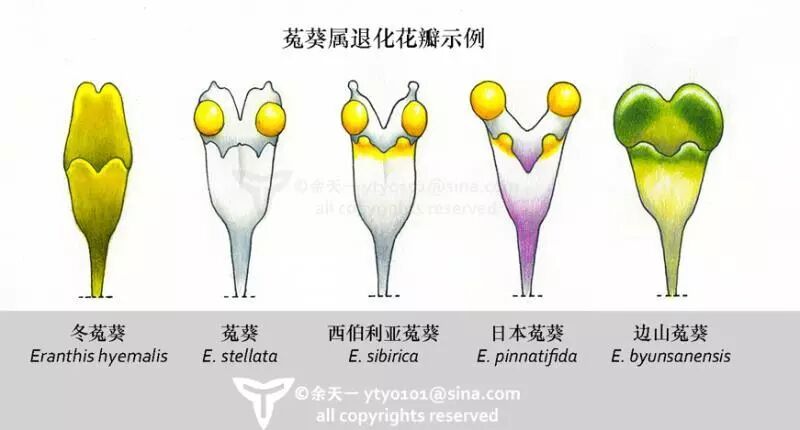 菟葵属的花瓣,注意菟葵、西伯利亚菟葵、日本菟葵的假蜜腺。绘图:余天一