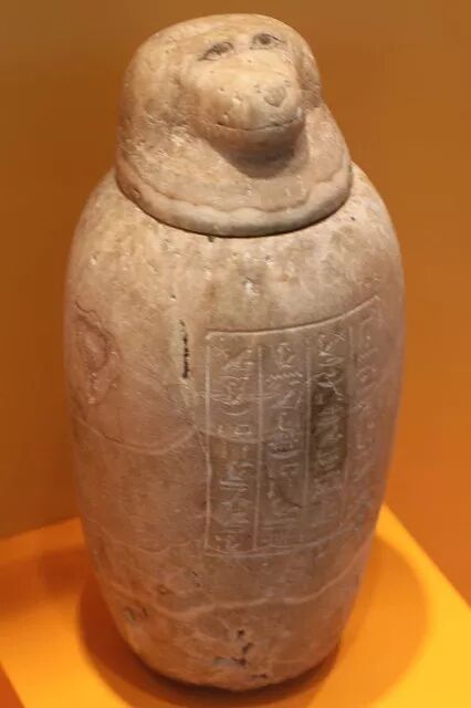 古埃及人用来存放木乃伊内脏的坛子,上面装饰着荷鲁斯神的儿子哈比神的头像。图片:Bin im Garten / Wikipedia