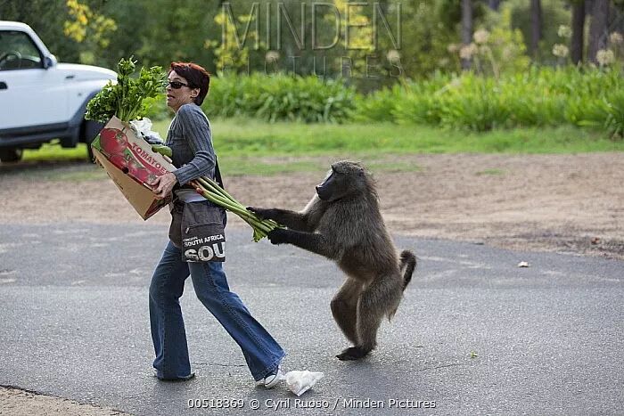 开普敦的狒狒属于豚尾狒狒(Papio ursinus),是狒狒里体型最大的一种,雄性体重可达30公斤,长着锥子般锋利的犬齿。曾有人被狒狒撞下山坡摔死的案列,被狒狒咬伤的人就更多了。