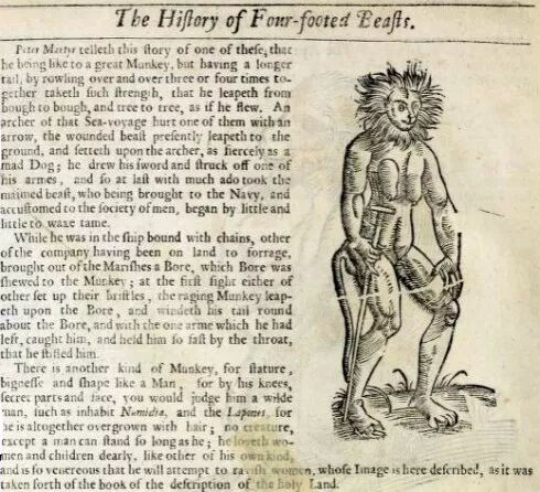 瑞士哲学家康拉德·格斯纳(Conrad Gesner)在1551到1558年间出版了《动物史》(Historiae animalium),堪称动物科学的奠基之作。这部书里的猴子图像,有的绘制得相当逼真,但阿拉伯狒狒的图像不伦不类:脸像猫又像猴子,脸周围的鬃毛好像太阳的光芒,四肢和躯干却酷似人型。