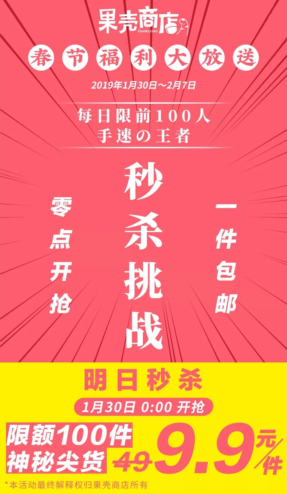 9天9款果壳商店秒杀福利,9.9元/19.9元的超低赔本价,2月中旬快递恢复运转后包邮寄给你。