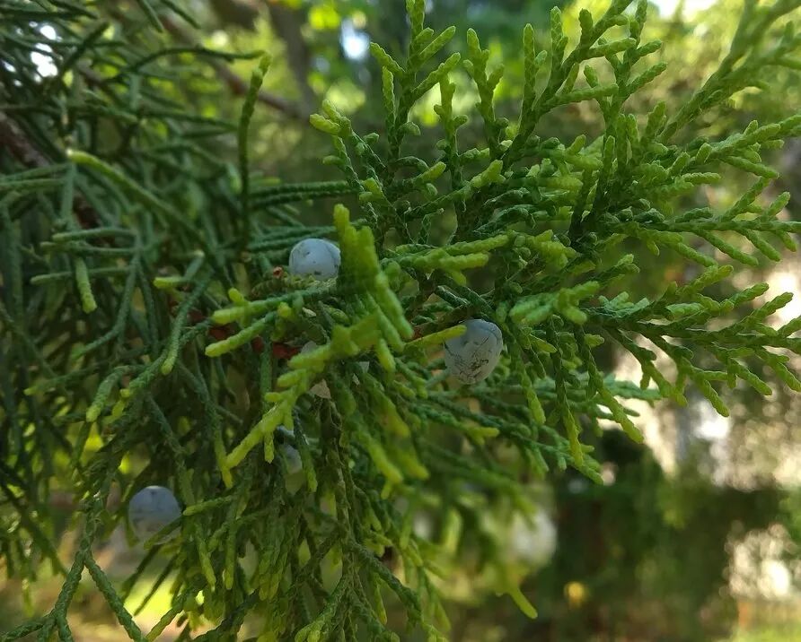 实际上,区分侧柏和圆柏(特别是圆柏老株),根本不用费劲细看叶子,只要看看它们的球果就好了。侧柏的球果,成熟后木质,开裂,红褐色;而圆柏的球果熟时不开裂,球形,青褐色,外面多少带白粉。