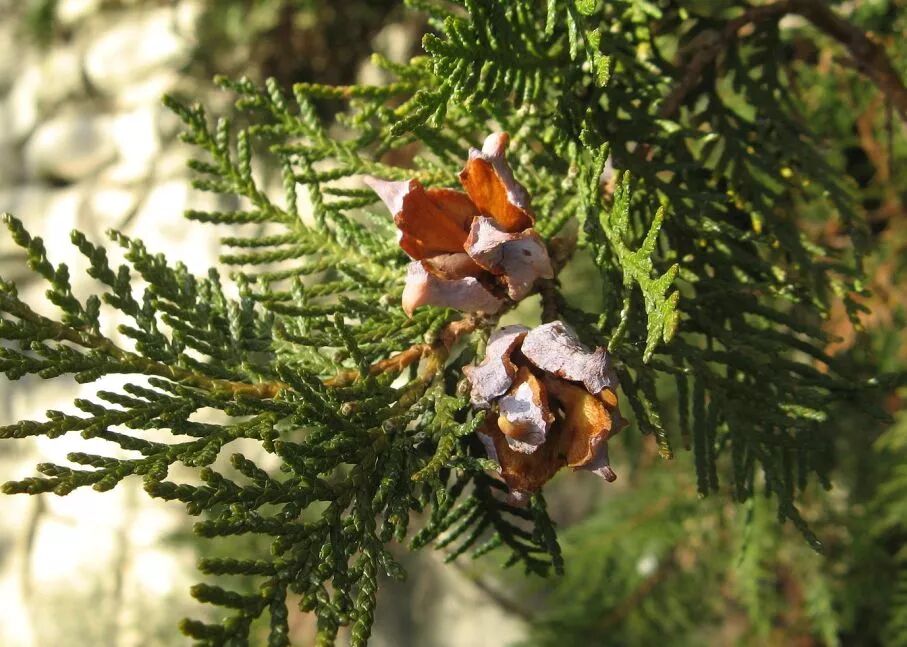 侧柏成熟开裂的球果。图片:Josef Grunig / wikimedia