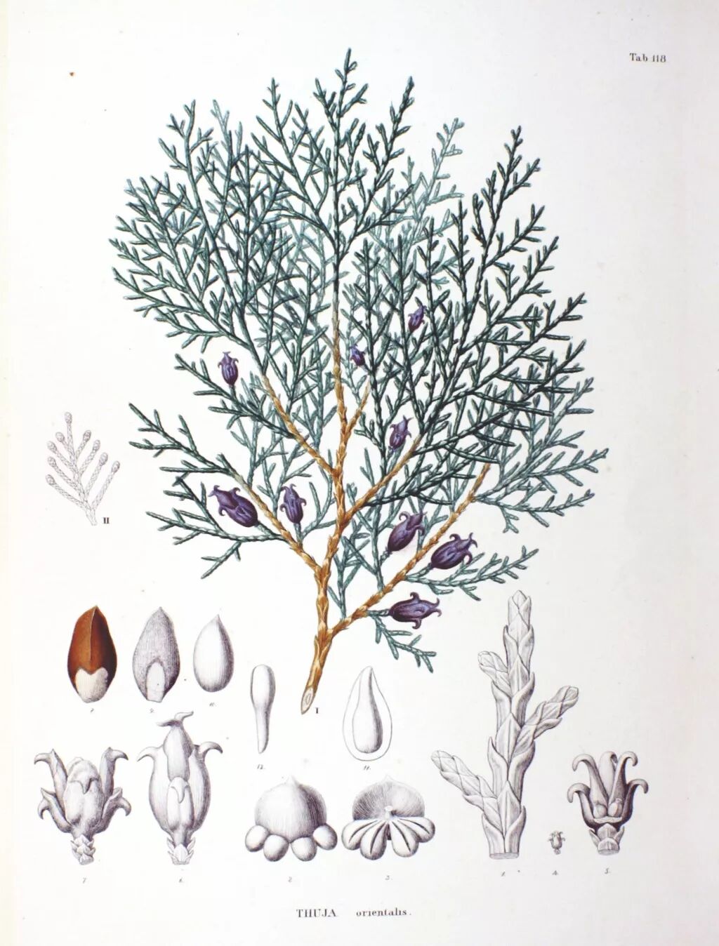 侧柏的科学插画。图片:Philipp Franz von Siebold and Joseph Gerhard Zuccarini / Flora Japonica, Sectio Prima(Tafelband)