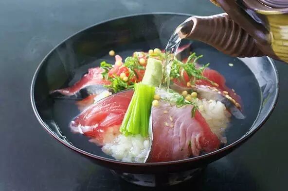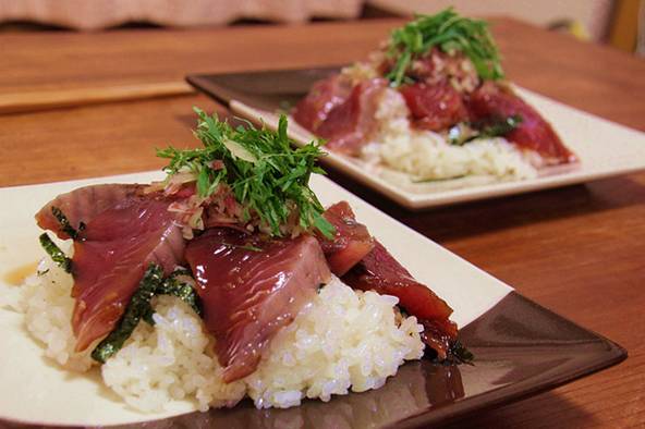 在软糯的白米饭上盖上鲣鱼刺身,浇上土佐酱油拌着吃,中途再浇上热煎茶或是鲣鱼清汤,就是能够慰藉心灵的无比美好的熏鲣鱼茶泡饭(鰹茶ずまし)。
