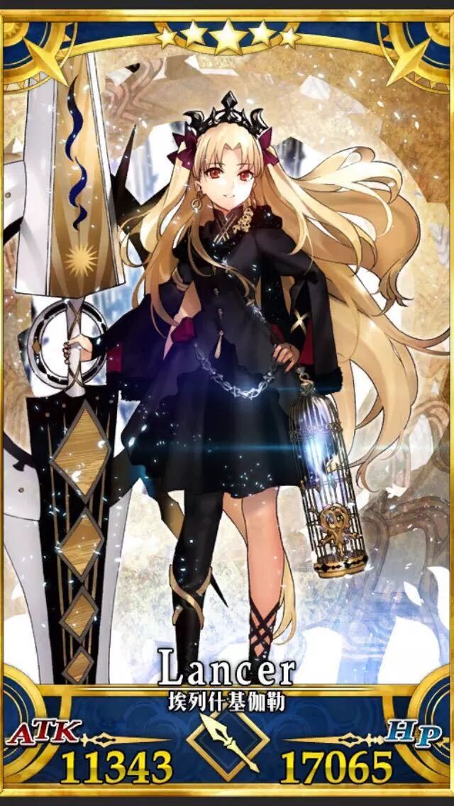 艾蕾酱:全名埃列什基伽勒,是美索不达米亚冥界女神凭依在型月亲女儿女主角之一远坂凛身体上形成的laner阶拟似从者,在Master间有着极高人气。