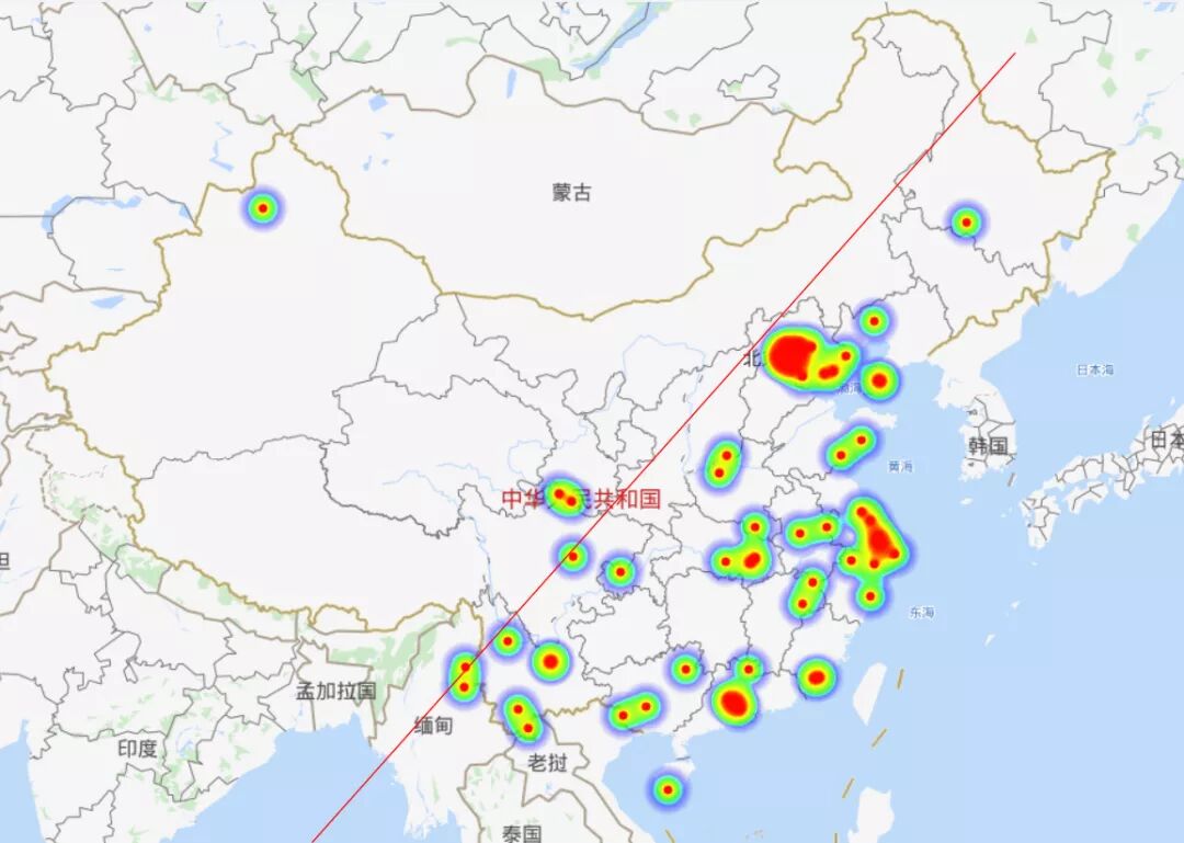 当然不只北京,理论上在塔克拉玛干沙漠与青藏高原以东的大部分地区,都可以见到蓝歌鸲。在中国观鸟记录中心的热点图中,绝大部分记录点都位于黑河-腾冲一线(胡焕庸线)以东。