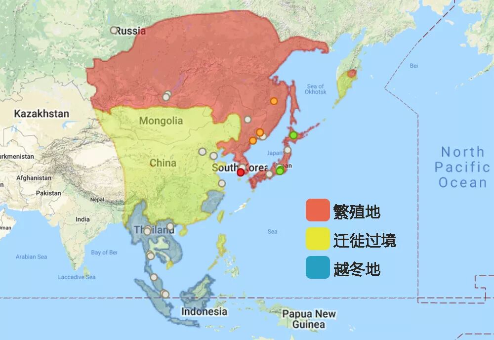 它的主要的繁殖地在广袤的西伯利亚(含库页岛)、中国东北局部、朝鲜半岛与日本,而越冬地主要在印度尼西亚、泰国等东南亚国家和地区。