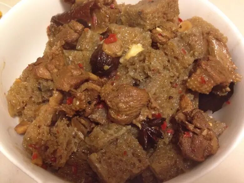 不过,粗糙加工的产品也能有好味道。相传峨眉山的和尚把吃不完的蒟蒻放在室外,被夜里天降的大雪掩埋起来。等到冰雪消融,重见天日的蒟蒻已经变了个样子,成了像冻豆腐一样多孔的东西。和尚试吃之下,发现口感更好,而且能吸收汤汁的味道,改善了蒟蒻不易入味的缺点,遂命名为雪魔芋。我这几天正好在峨眉山,又吃了几回雪魔芋烧鸭子,味道着实不错,可惜和尚尝不到(也不一定)。如今峨眉山游人如织,本地出产的雪魔芋早已不敷市场需求,要从其他产区输入。好在雪魔芋生产工艺没什么技术含量,外来货吃起来也没啥区别。