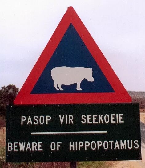 在南非德兰士瓦的克鲁格国家公园附近立有这样的警示牌,提醒人们小心河马。图片:Georgio / Wikipedia