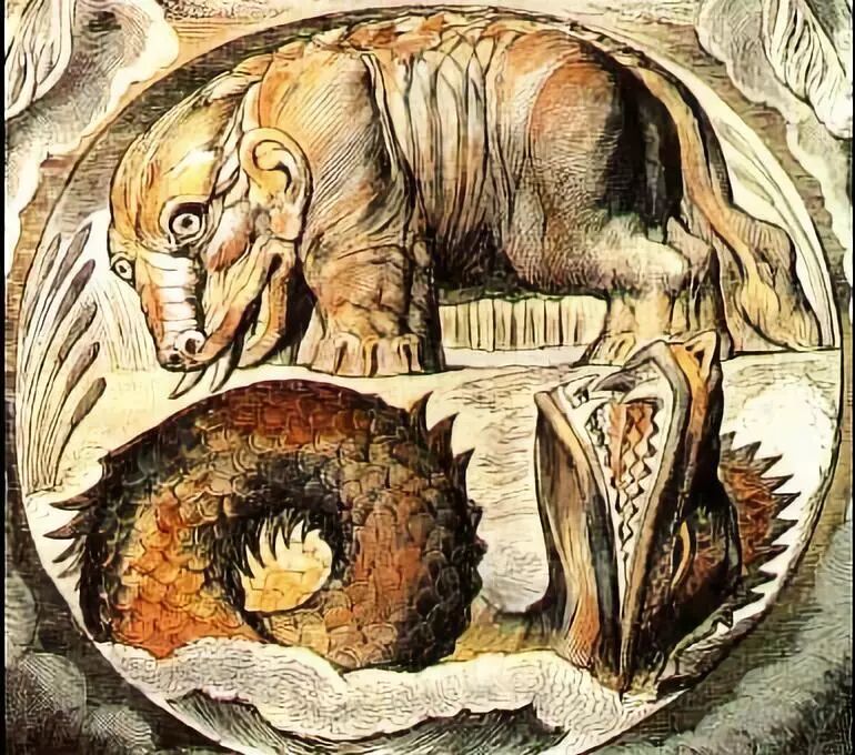 在《约伯记》的插图“巨兽与海魔”中,贝西摩斯状似河马,嘴生獠牙,人耳狮尾;而利维坦头部似鳄,是海魔。图片:William Blake