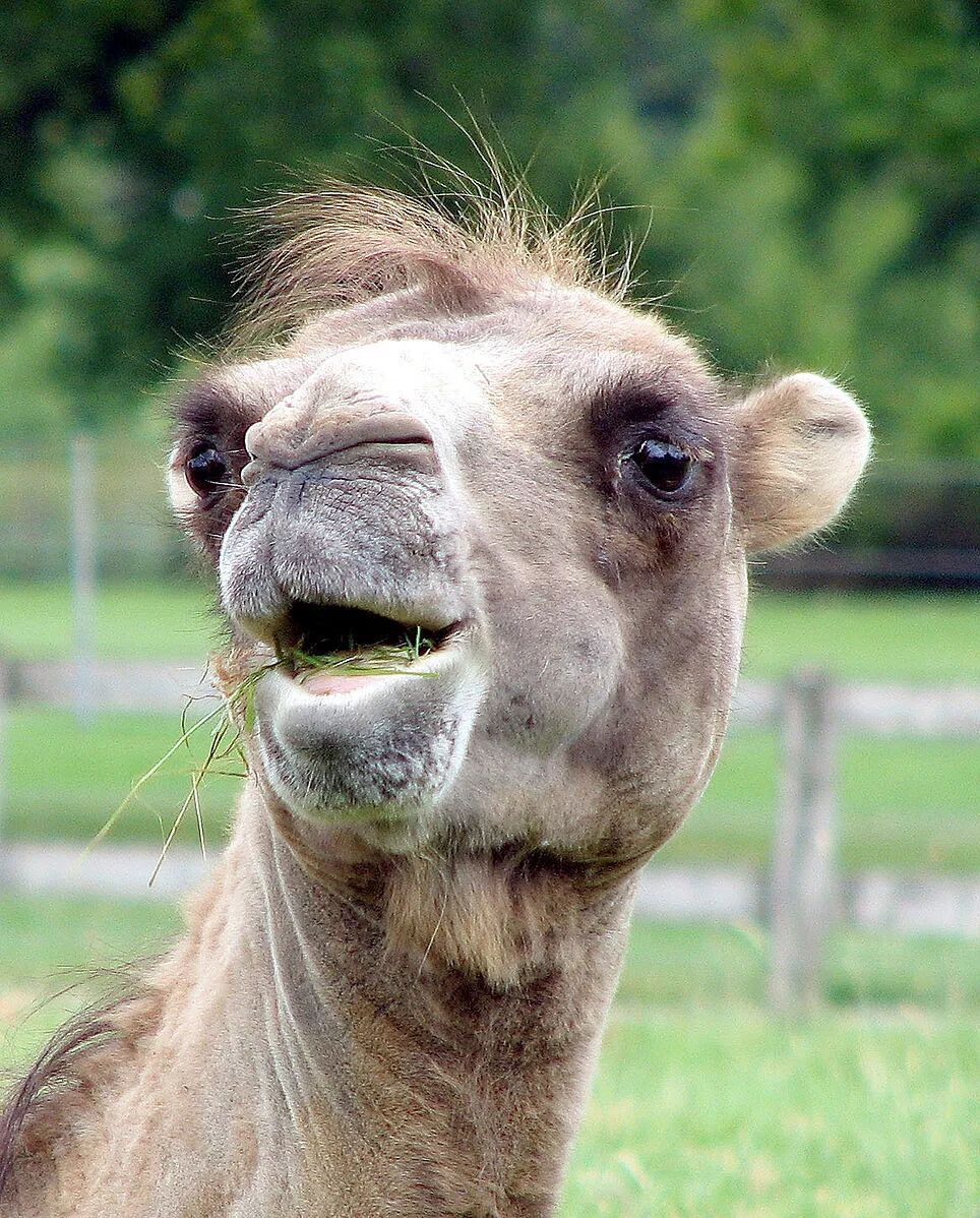 骆驼们作为非典型有蹄类,共同点还有后大腿和身体的连接处很高,因此真的可以屈膝跪坐在自己大腿上休息,并且迈开大长腿走路还是顺拐。它们也反刍,但只有三个胃(牛、羊是四个胃),必要时可以精准吐出半消化的食物糊浆来趋避敌害。