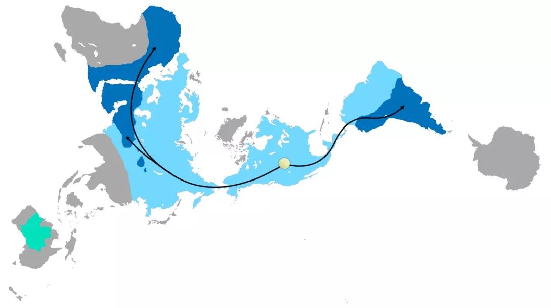 骆驼的起源与演化示意图。浅蓝色为骆驼类动物曾经的分布区,深蓝色为现在的分布区,绿色是人为引入地区。图片:Andrew Z. Colvin / wikimedia
