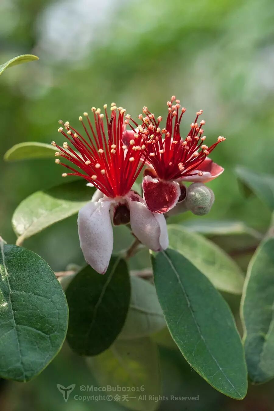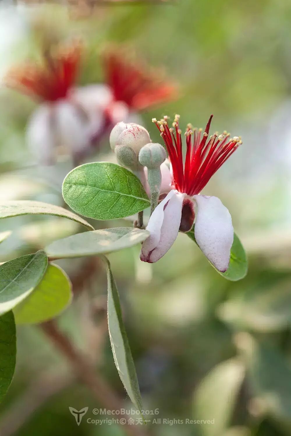 桃金娘科(Myrtaceae)盛产水果(比如莲雾/洋蒲桃、番石榴、红果仔、嘉宝果等),斐济果也是它们的一员。斐济果不像它的不同属近缘亲戚番石榴一样普及,是因为它在众多食用水果中口味并不出众(虽然番石榴的味道很多人也难以接受)。不过,斐济果株型小而紧凑,叶片圆而排列有序,花也很是鲜艳可爱,所以倒是在园艺界大热。而且它对土壤环境要求不高,易于栽培,因而成为亚热带地区常见的园林植物。斐济果花瓣肥厚而强烈向内卷曲,可以食用,味道据说甜而微辣;有时候花瓣反卷直至内侧的红色完全无法得见,只能看到明晃晃的白色外侧部分,而这白色又与烟花一样张扬的红色雄蕊群相得益彰,非常精致。