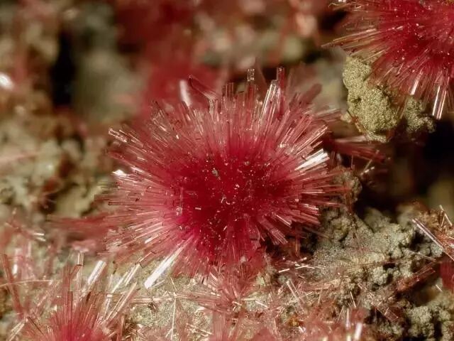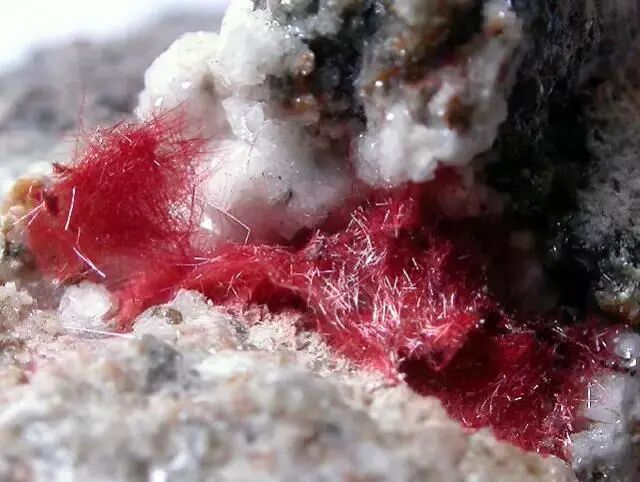 毛赤铜矿(Cuprite var. Chalcotrichite)颜色更红,但是不会放射性生长,只会变成一坨乱糟糟的毛毛。图片:Peter Haas / mindat.org
