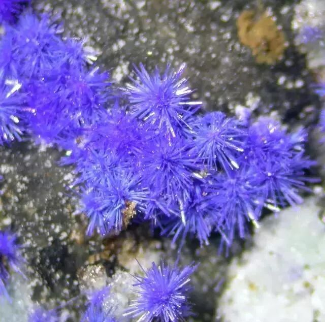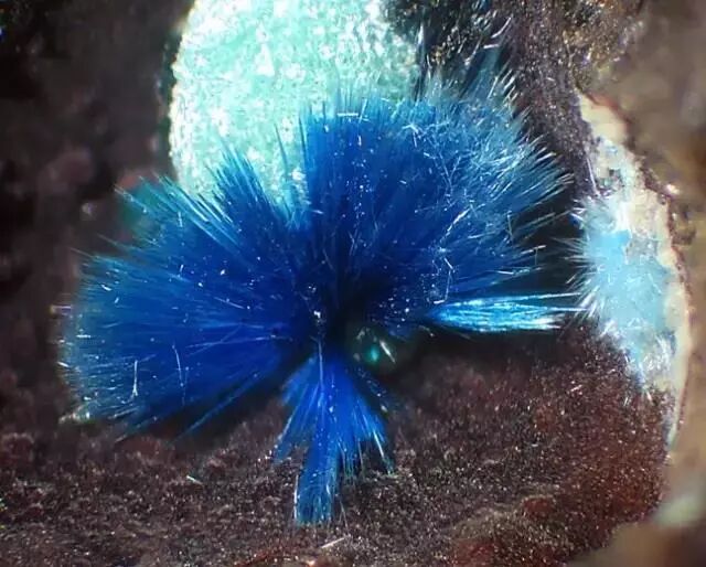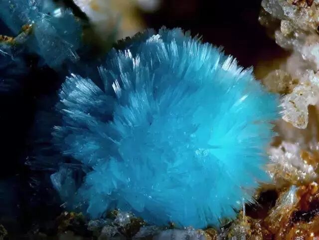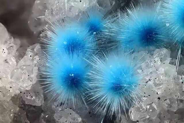 其实矿物界里的“毛球”远不止纤水硅钙石一种,有很多矿物会长成彩色的“毛球”,根本不需要染色。例如,名字听上去就很萌的绒铜矿(Cyanotrichite),因为含有铜元素,所以呈现出明亮的蓝色。