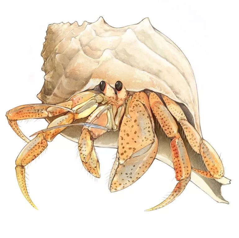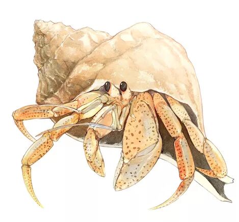 就连搭配的小配角也要仔细考据。比如下方的左图是大指寄居蟹的第一稿,已经足够精美,但制作团队复核的过程发现选错了“模特”,所画的峨螺生活在黄海、渤海,北美洲的大指寄居蟹根本遇不上它。查证、重新找模特、重画、复核,才有了最终印上日历的右图。