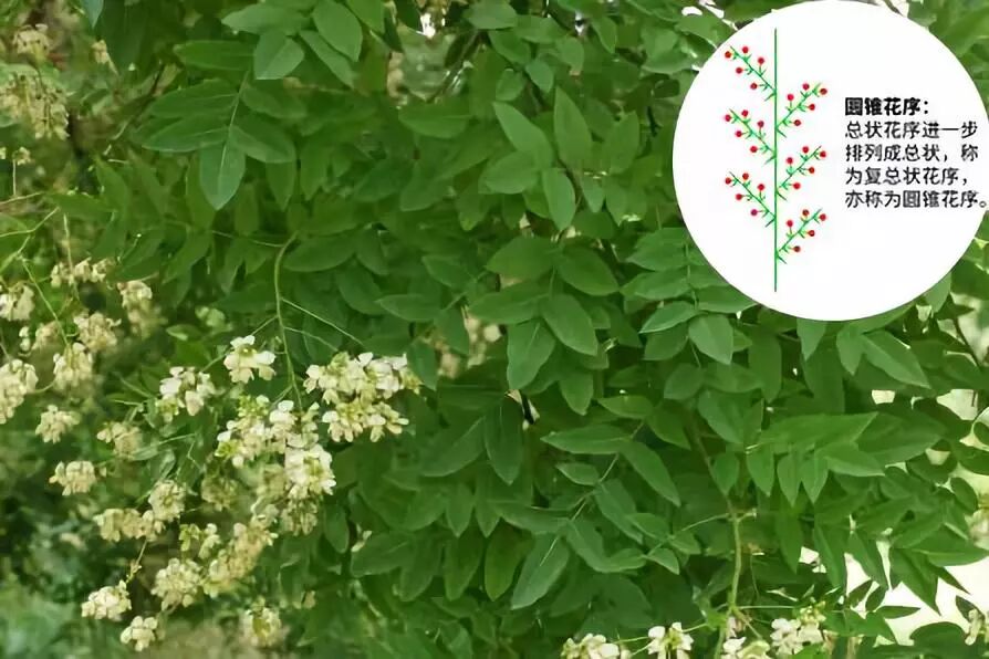 槐的圆锥花序顶生。图片:Pflanzio.com;制图:雪梨