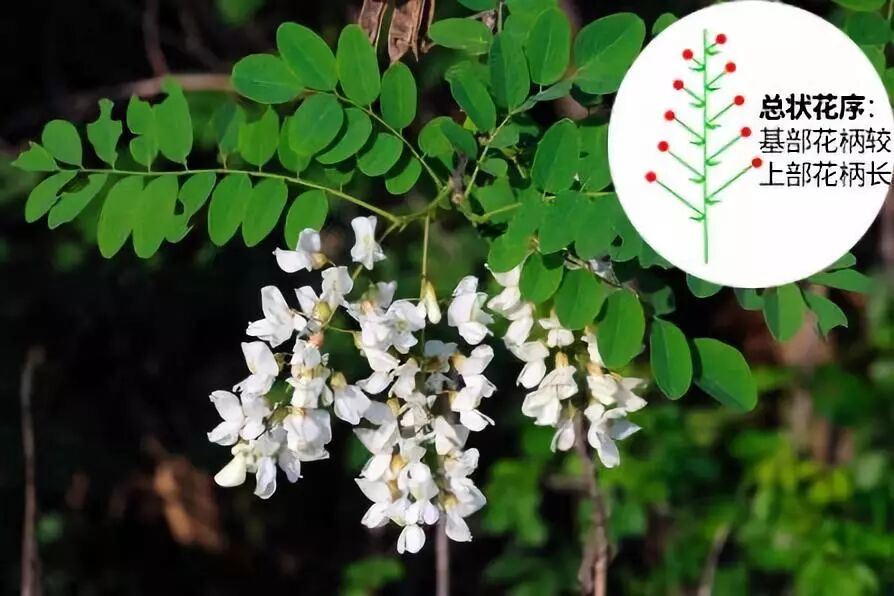 洋槐的总状花序腋生。图片:nature wiki;制图:雪梨