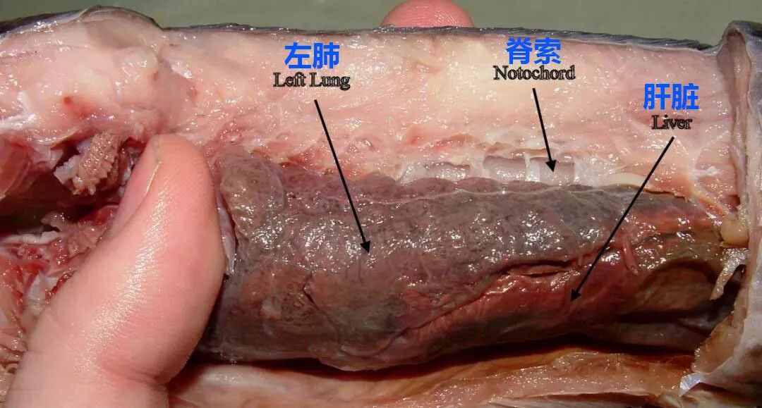 肺鱼的肺,最左边箭头所指。图片:Mokele / English Wikipedia