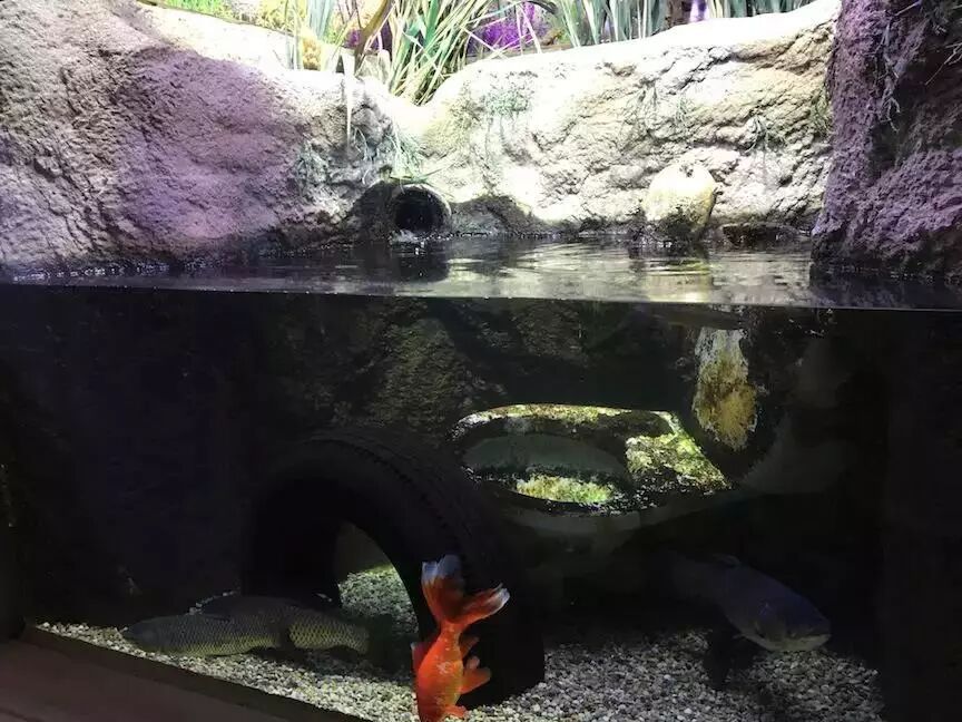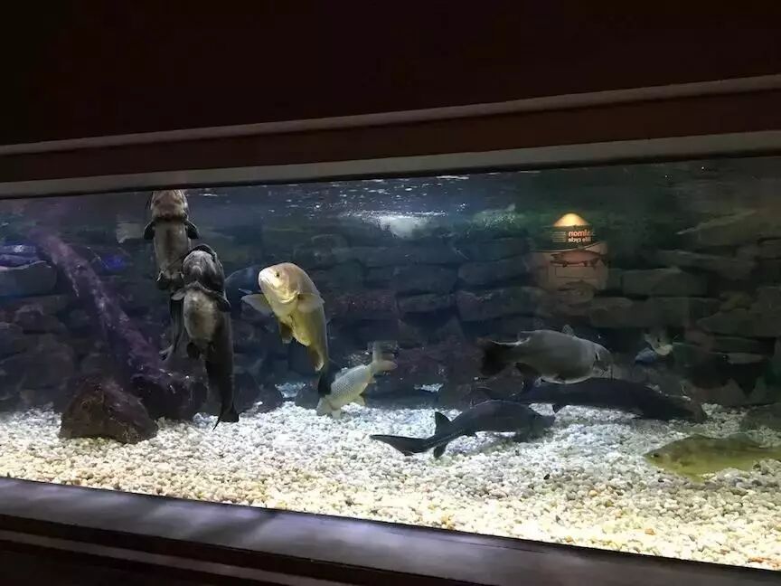 另一个让游客自己体会的是这个有轮胎、排水口和马桶,名字叫做“俄亥俄入侵者”的缸——大家肯定一眼就能看到里面的一条金鱼。没错,这个缸里是各种“亚洲鲤鱼”,基本上是指代我国的“四大家鱼”。各种金鱼都是鲫鱼的选育品种,而缸里其余几条大鱼是国内常见的草鱼。亚洲鲤鱼恐怕是北美各水系最出名的入侵物种。目前,鲤鱼已经遍布五大湖,草鱼也常有发现,而鲢鱼和鳙鱼已经沿着密西西比水系一路向北,兵临城下。湖畔的美国各州如临大敌,俄亥俄也不例外,从监测到捕捞一丝不苟。