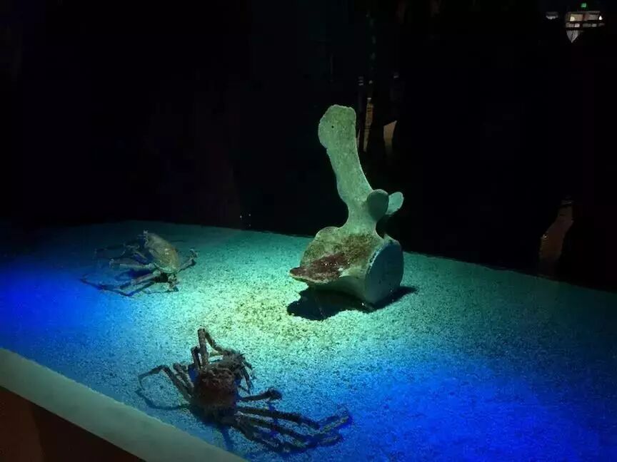 甘氏巨螯蟹的展示缸,模拟了深海底栖环境。缸中这块鲸的椎骨用来讲解“鲸落”——鲸鱼在海洋中死去留下的尸体,因为无法被微生物快速分解,所以会沉入海底。图片:卢平