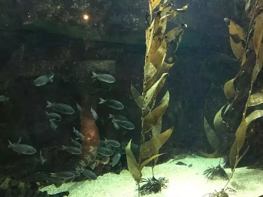 水族馆里少不了一个能养乌翅真鲨的大水族箱,但让我印象深刻的是一系列相对较小的鱼缸,按照不同的生境分别展示。每个缸旁边的屏幕都会介绍这种生境的分布范围、典型生物和趣味性知识。这是个太平洋沿岸海藻林的展示缸,麻雀虽小,豹鲨不能少。在海藻林的原产地——美国加州的蒙特雷——有个更大的海藻林缸,我会在之后的文章里跪着讲讲,别错过。