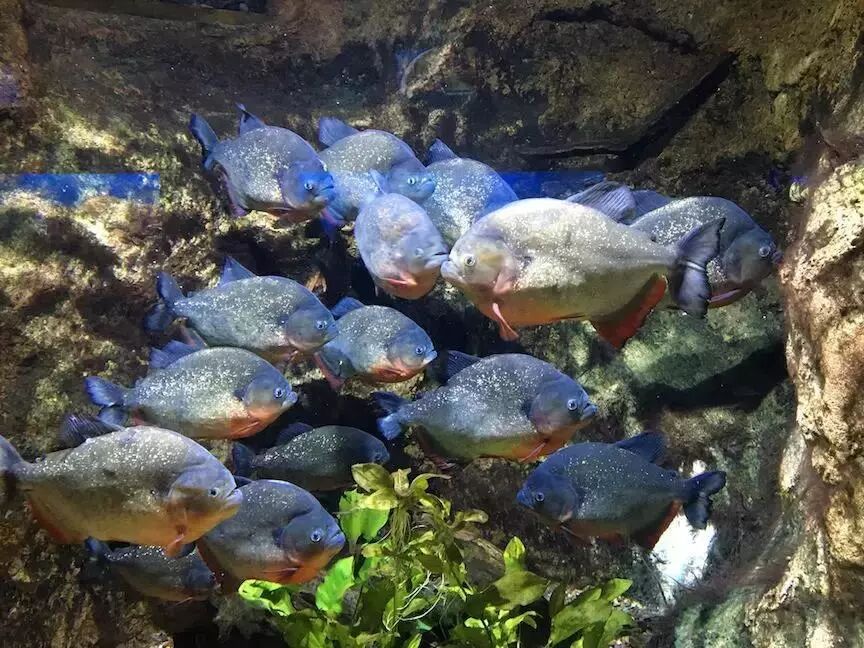纳氏臀点脂鲤又被叫作“红腹食人鱼”,生活在南美洲的热带河流湿地中。在这片游弋着凯门鳄、巨骨舌鱼、亚马逊河豚的凶险水域,纵使长着一嘴利齿,纳氏臀点脂鲤也只能通过群聚来降低每个个体被捕食的风险。不知道是不是为了表现“食人鱼”的可怕,这个缸底放了个水豚的头骨让游客自己体会。