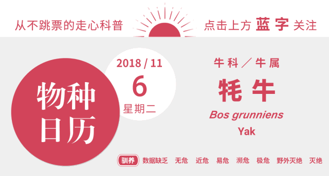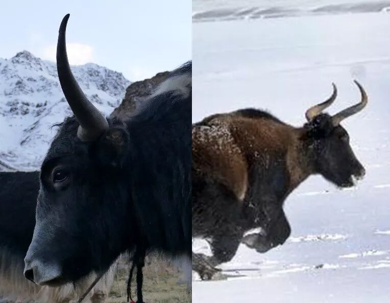牦牛,包括家牦牛(Bos grunniens)和野牦牛(B. mutus)。大约7000年前,家牦牛从祖先野牦牛中被驯化而来。目前主流的分类方法将野牦牛和家牦牛视为不同物种,也有部分学者将野牦牛作为家牦牛的一个亚种——谁叫林奈老爷子1766年就命名了家牦牛,而野牦牛直到1883年才由战斗民族的普热瓦尔斯基(Nikolay Przhevalsky)采集到模式标本并命名。