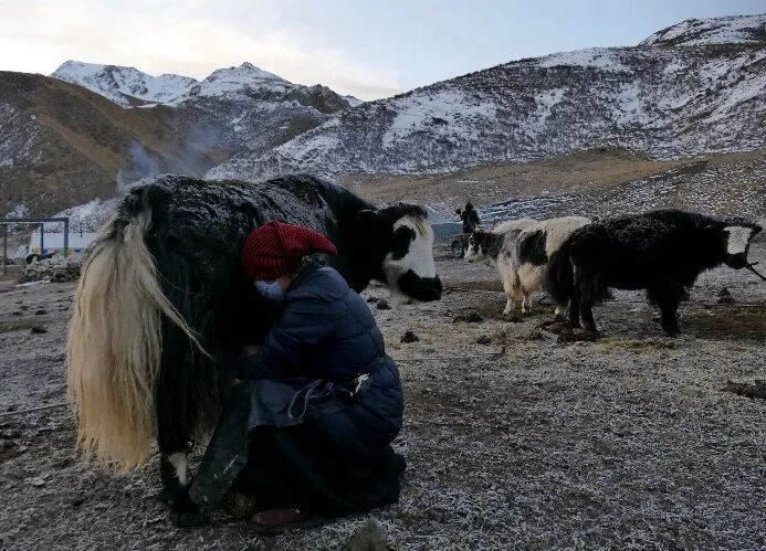 人类需要牦牛的奶和粪便,于是每天晚上要将牦牛赶回帐篷边一只只栓起来,第二天早起迎着第一缕阳光捡起一坨坨最新鲜热乎的晨便,然后抢在急切喝奶的小牛之前挤好牛奶。