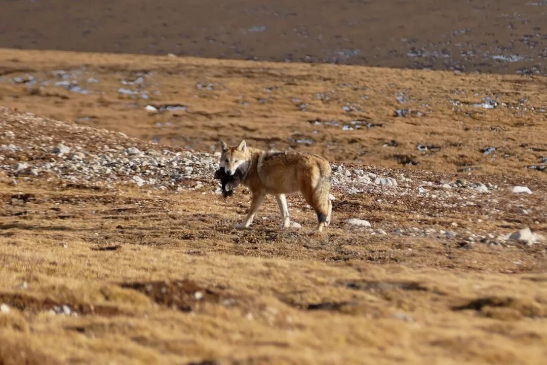 一只狼嘴里叼着一根牦牛幼崽的腿,但这次它不是凶手,只是捡了棕熊昨夜的残羹冷炙。图片:山子