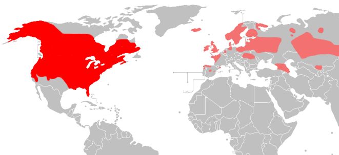 美洲水貂在美洲的原始分布区(红)和入侵欧洲后的分布区(浅红)。图片:Osado / wikimedia