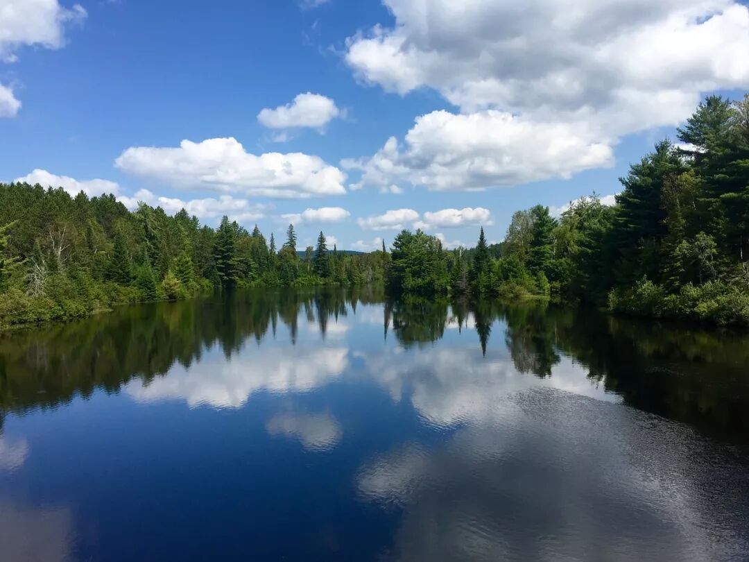 小河清清亮亮的,流到远方去。需要很仔细看才能看到河水在流;它安静得就像是把天上的云都装到里面似的。水面倒映着天空,一朵朵白云在里面一动不动。仔细看的话,还能看到河底的卵石,和天上的云混在一起。