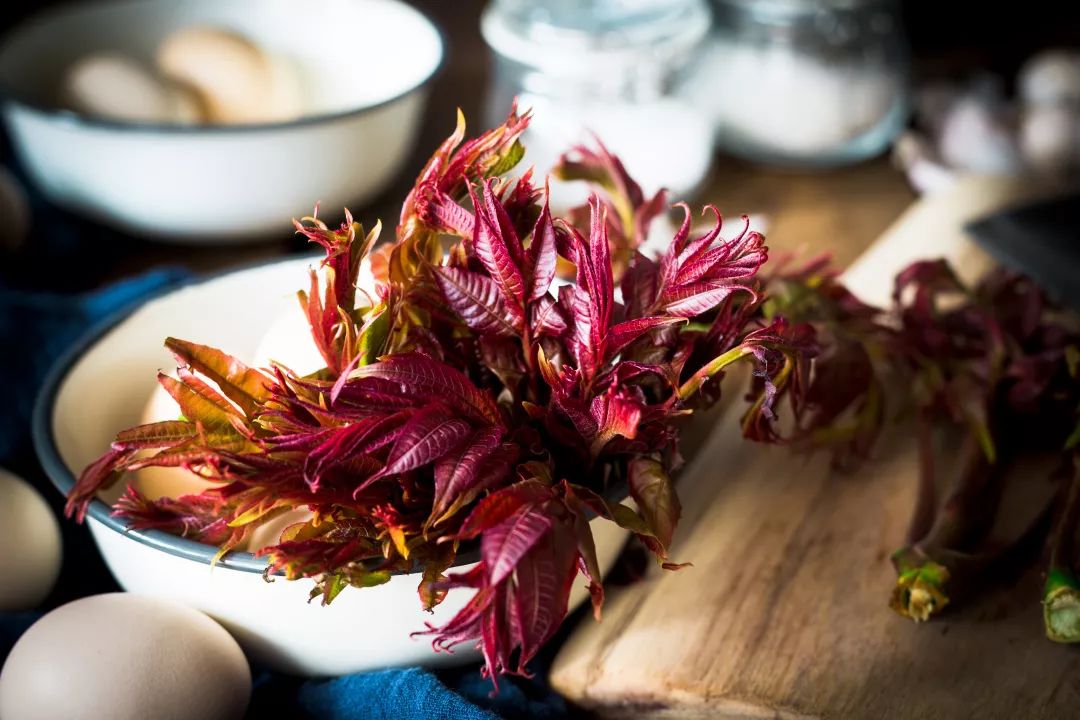 比如炒鸡蛋的香椿,嫩叶就是红色的。图片:图虫创意