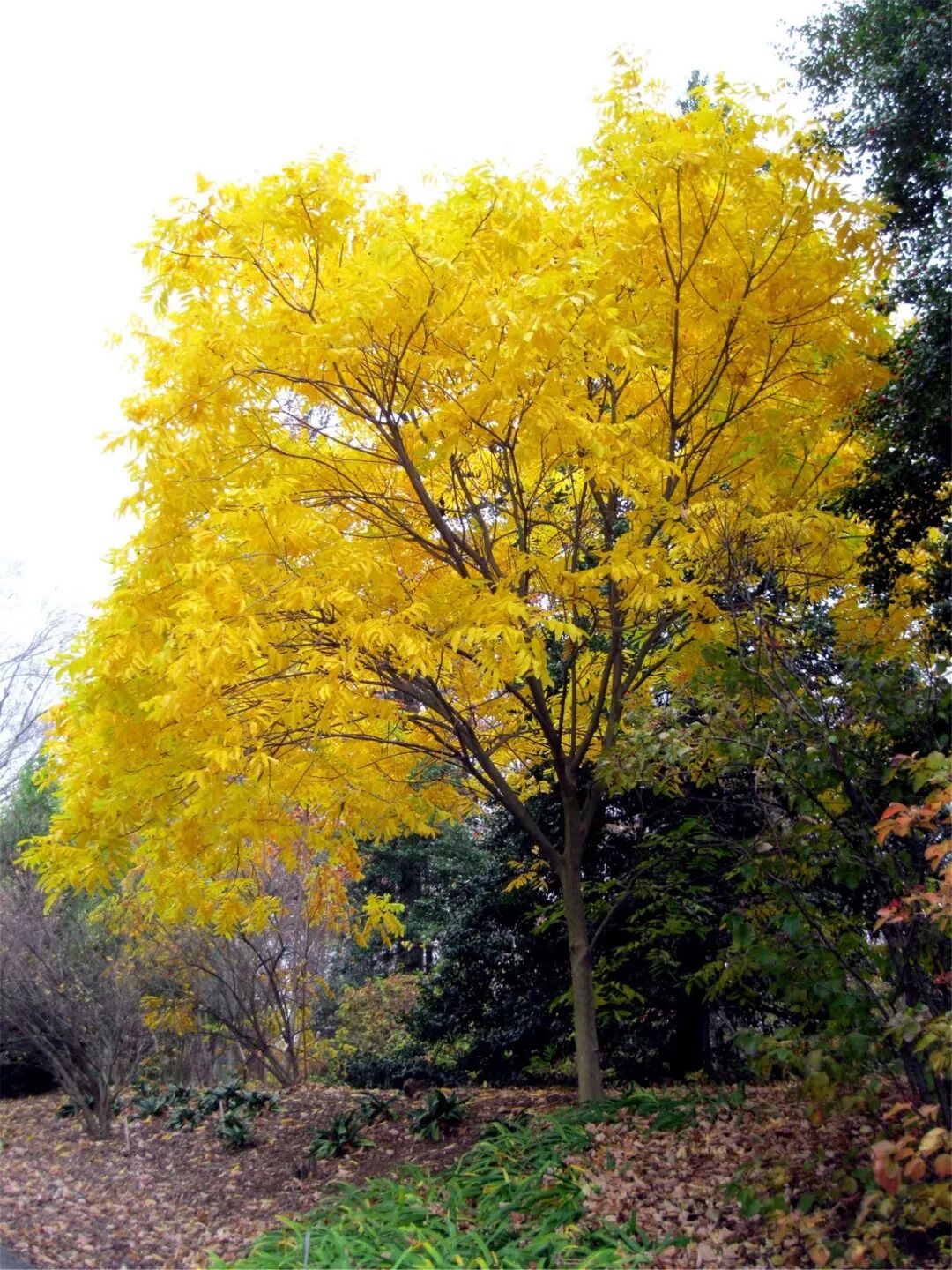 入秋后,鹅掌楸的叶子常转变成醒目的金黄色,运气好的话,还可以看到枝顶结出圆锥形的果实,里面一粒粒种子均有长条形的翅膀,成熟后往往只需一阵风吹,便可从树上飞飘落。