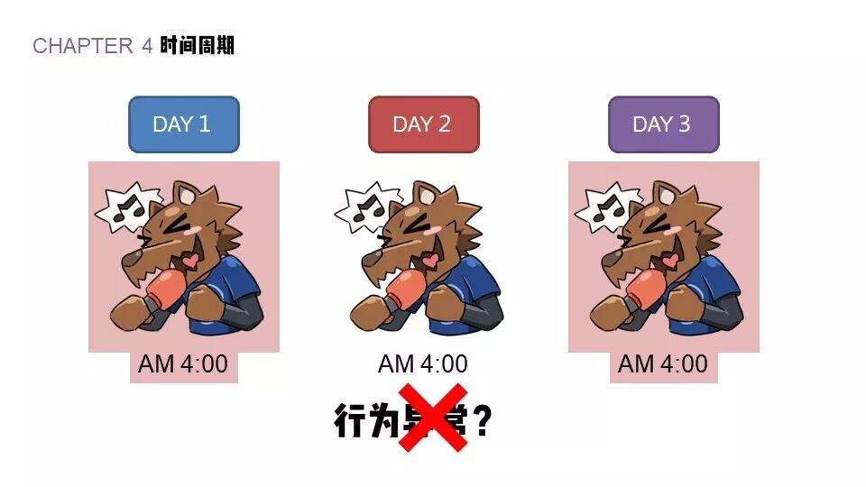 所以说,如果你的观察时间不一致的话,很难判断他的行为是不是异常的。观察的周期建议尽可能长。比如还拿卢平老师举例,我观察他,连续看一个月,发现他每天都在四点唱歌;结果有一天他四点不唱歌而在干别的事情——那这一天,我才能说他的行为是异常的。