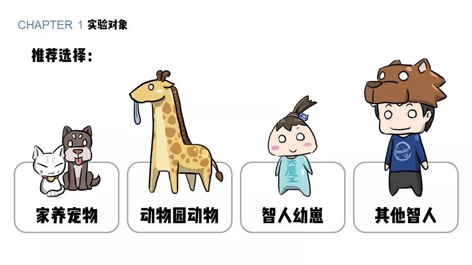 所以,要把握前面这三个原则,我在这里给大家推荐很好观察的实验对象:家养的宠物是一个很好的选择,如果城市里有动物园的话,也可以去看看动物园里的动物。我们身边还有一种很容易找到、但又很容易被大家忽略掉的动物,就是智人,包括智人幼崽、你的同事、朋友或者是同学。比如我今天可能就会不停地拿卢平老师来举例子。不过,研究智人可能有一定的不方便,这个不方便我们接下来再说。