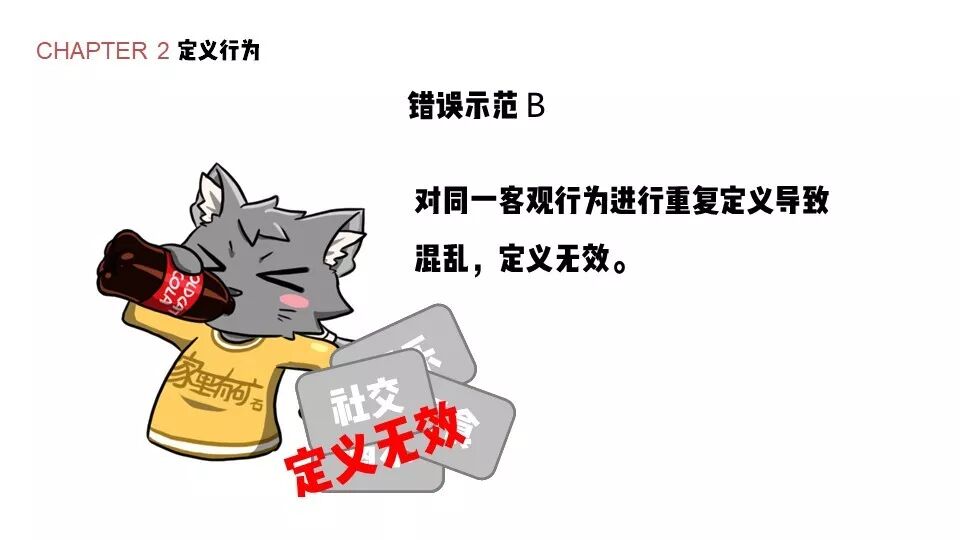 第二种情形,我第一天在记录上把老猫老师喝可乐记录为喝水,第二天它被记录为摄食,第三天它变成了社交,第四天它的记录又变成了娱乐……那这一份实验报告在别人看来,同一行为在不同记录上标注的标签是不一样的,那也会让人产生混乱。这样的行为定义也是无效的。