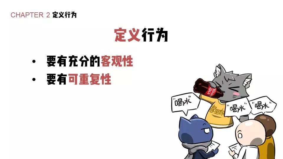 第一,定义必须客观。什么叫客观?比如说,我现在把老猫老师喝凉茶的行为定义为喝水,结果实际实验做下来发现老猫老师根本就不喝凉茶,那可能留下“老猫老师十天没喝水”的记录,正常人都会觉得这是有问题的。所以,如果你定义的行为,在实际观察的时候你的实验对象压根不会做,那你的定义就是无效的。