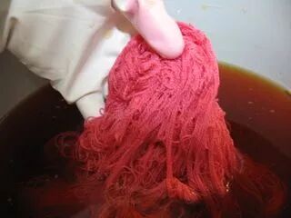 4、最后还要再加一次石榴汁或乌梅汁,继续用醋/米汤也可以,这些酸性的溶液可以中和掉草木灰,把溶液调回中性,这样得到的纯正红色染液,就可以用来染色了。